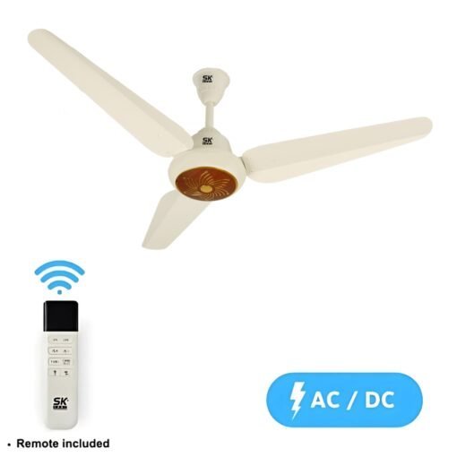 This ceiling fan is available in Black A-2, Cream A-1, Cream A-2, and Cream Black colors, with 48″ and 56″ size options. It operates on both AC (220V) and DC (12V) power, consuming 50 watts with rated speeds of 380 R.P.M (AC) and 365 R.P.M (DC). The package includes a motor, blades, down rod, clamp, screws, nuts, and a remote control for convenient operation.